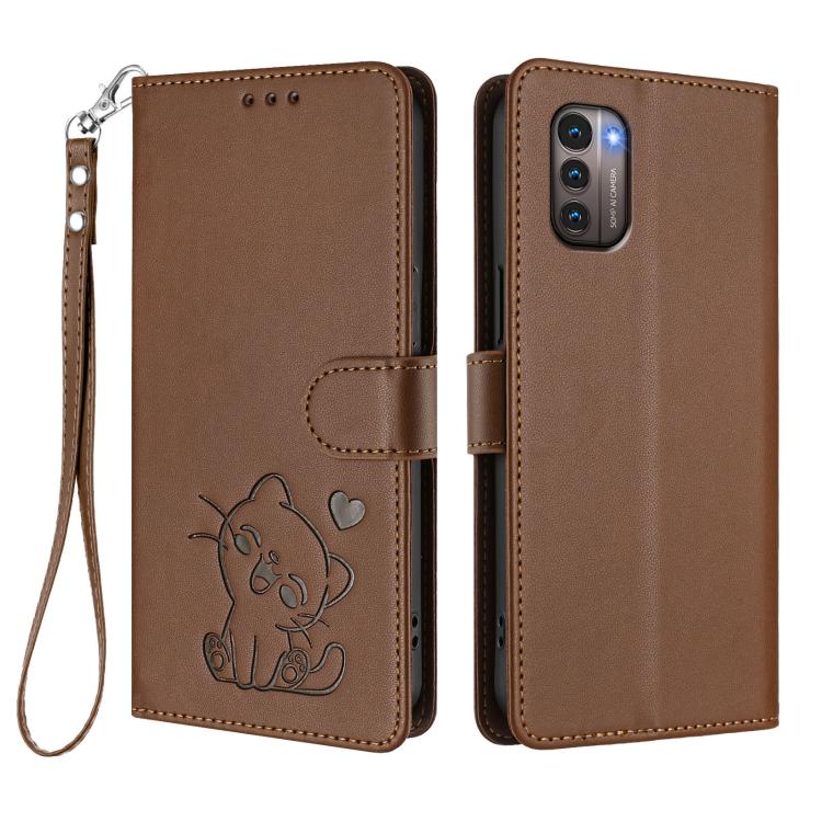 For Nokia G21 4G / G11 4G Embossed Heart Cat Leather Phone Case with Hand Strap(Brown)