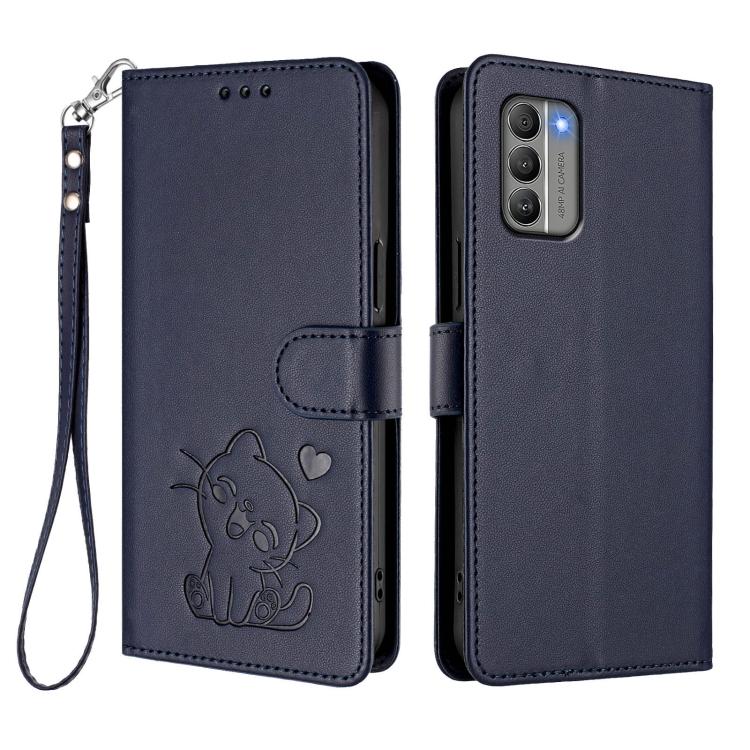 For Nokia G400 Embossed Heart Cat Leather Phone Case with Hand Strap(Blue)