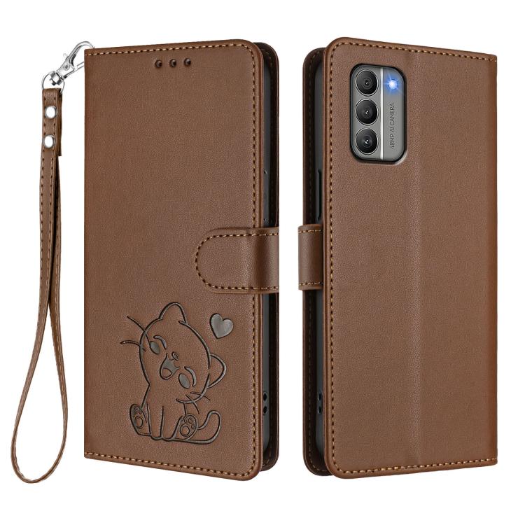 For Nokia G400 Embossed Heart Cat Leather Phone Case with Hand Strap(Brown)