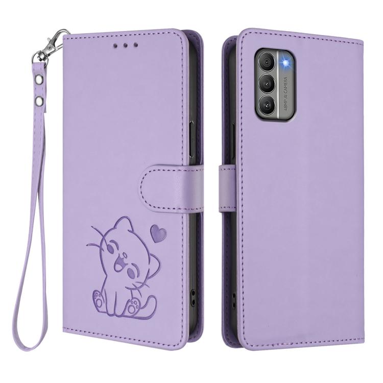 For Nokia G400 Embossed Heart Cat Leather Phone Case with Hand Strap(Light Purple)