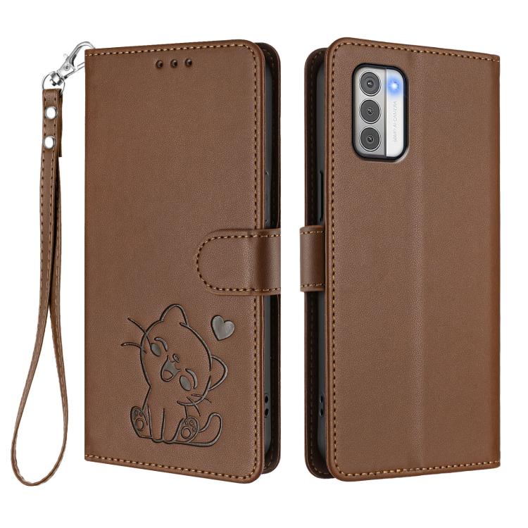 For Nokia G42 / G310 Embossed Heart Cat Leather Phone Case with Hand Strap(Brown)