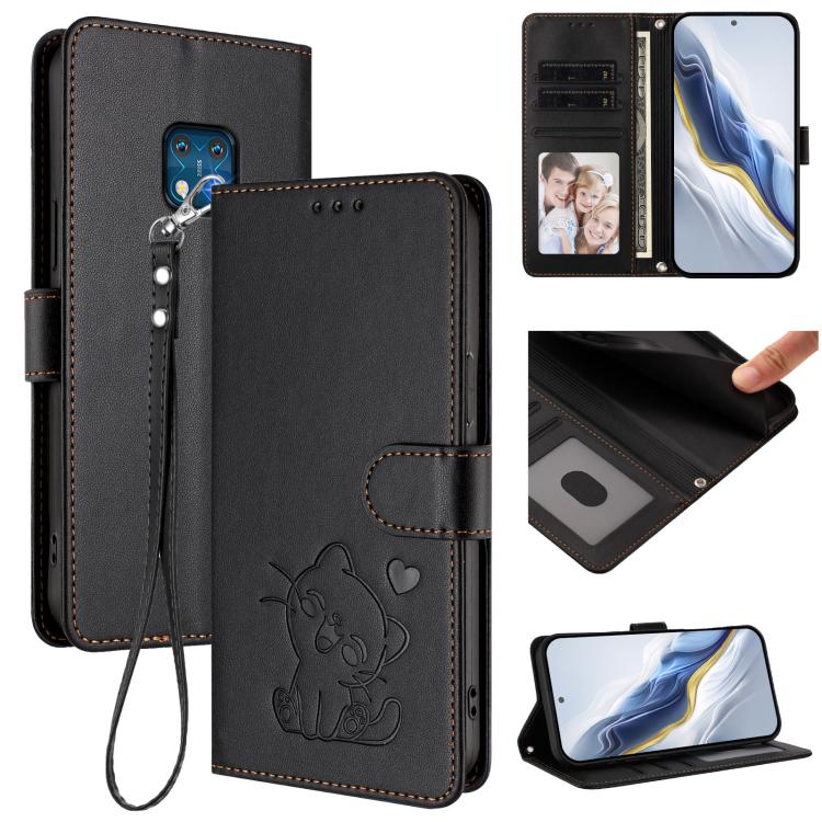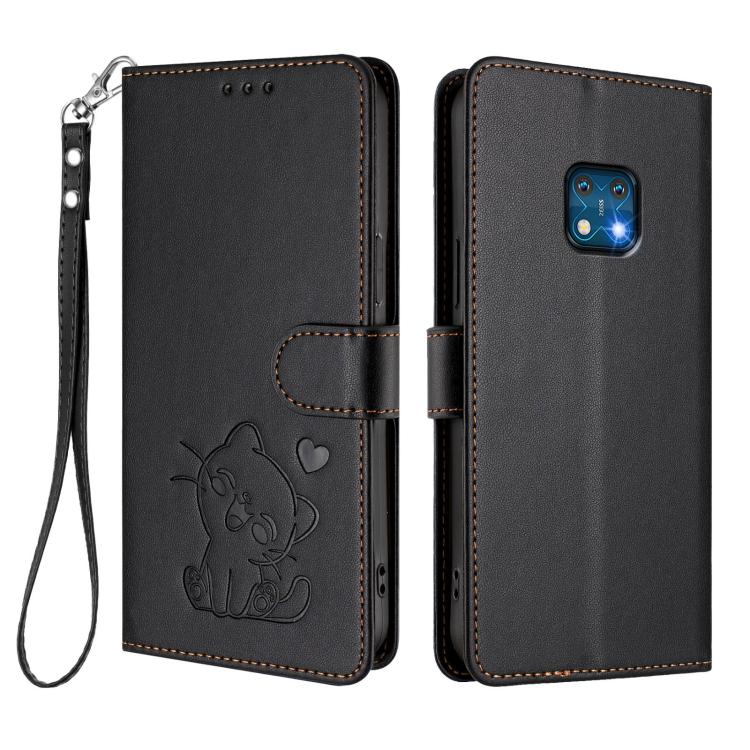 For Nokia XR20 Embossed Heart Cat Leather Phone Case with Hand Strap(Black)