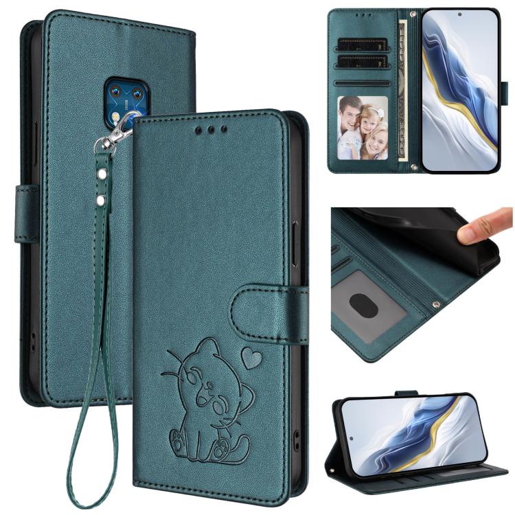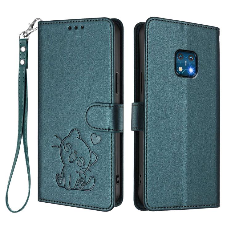 For Nokia XR20 Embossed Heart Cat Leather Phone Case with Hand Strap(Dark Green)