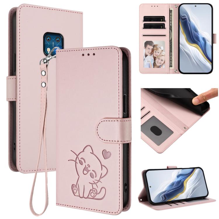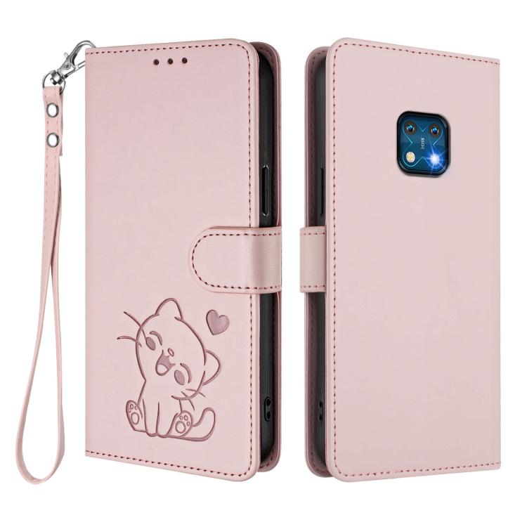 For Nokia XR20 Embossed Heart Cat Leather Phone Case with Hand Strap(Pink)