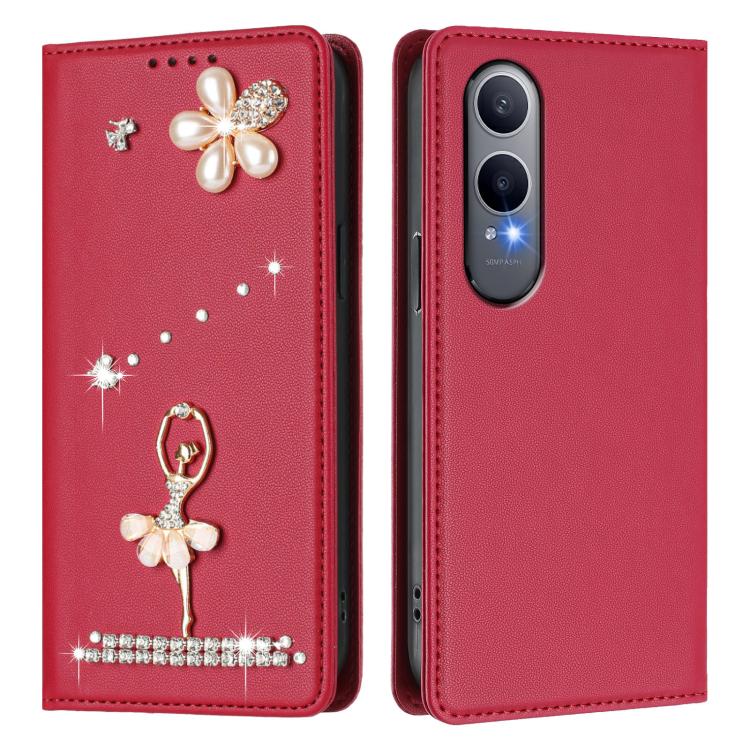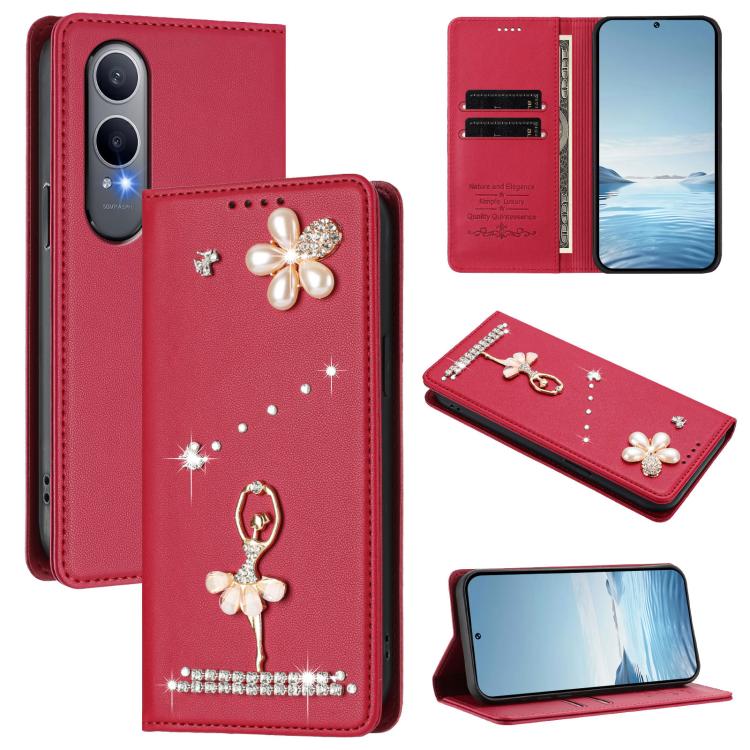 For OnePlus Nord CE4 Lite 5G Global Ballet Girl Diamond Studded RFID Vegan Leather Phone Case(Wine Red)