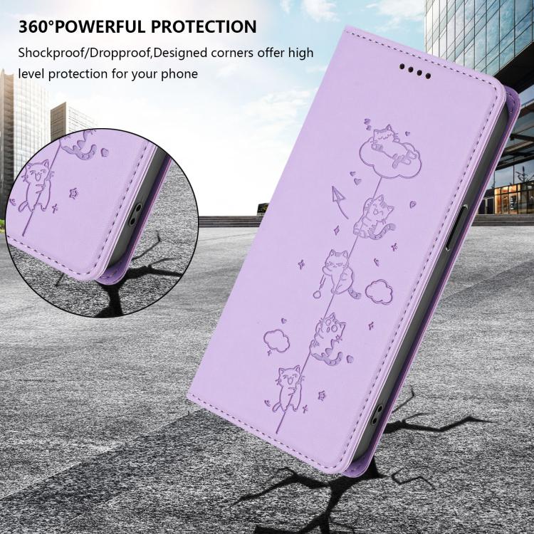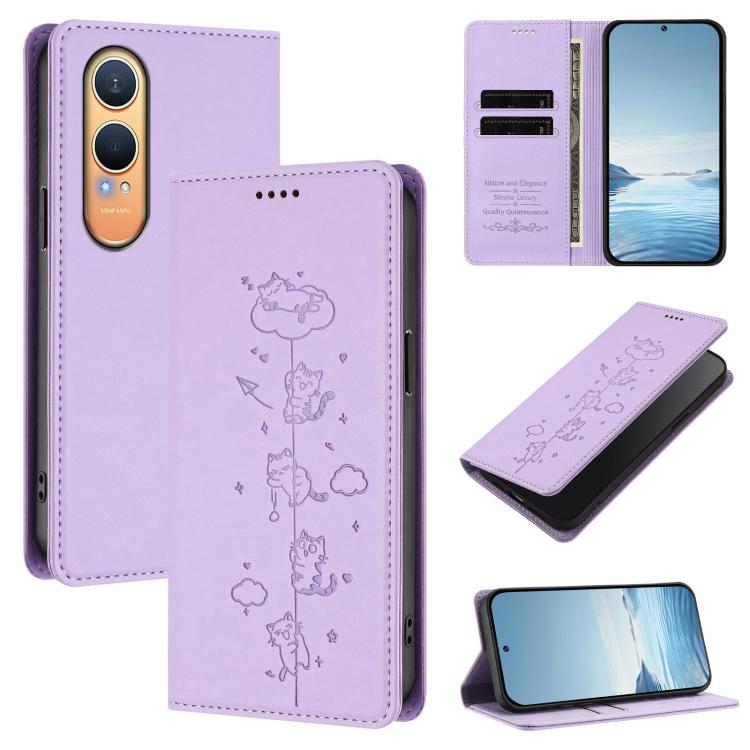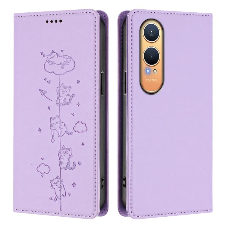 For OnePlus Nord CE4 Lite India Cute Cats Embossed Magnetic RFID Vegan Leather Phone Case(Light Purple)