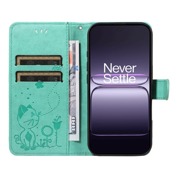 For OnePlus Nord CE5 Cat and Bee Embossed Flip Leather Phone Case(Green)