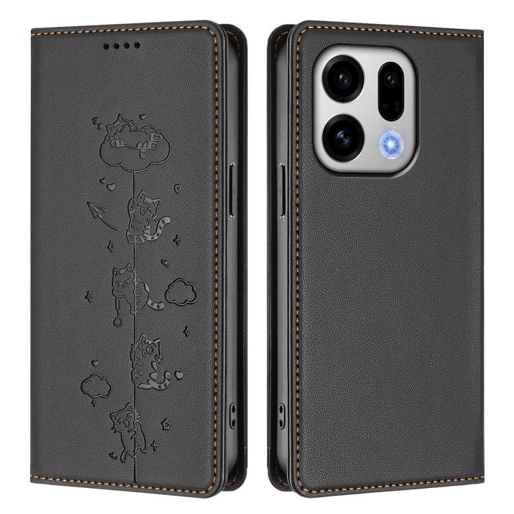 For OPPO Find X9 Cute Cats Embossed Magnetic RFID Vegan Leather Phone Case(Black)