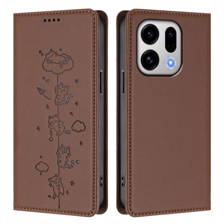 For OPPO Find X9 Cute Cats Embossed Magnetic RFID Vegan Leather Phone Case(Brown)