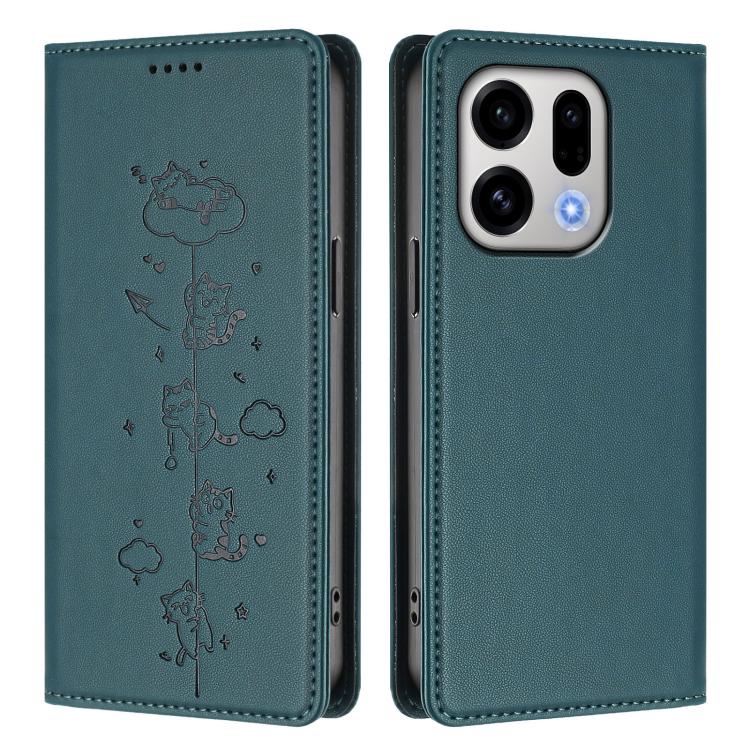 For OPPO Find X9 Cute Cats Embossed Magnetic RFID Vegan Leather Phone Case(Peacock Green)