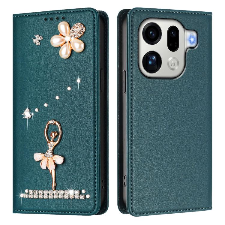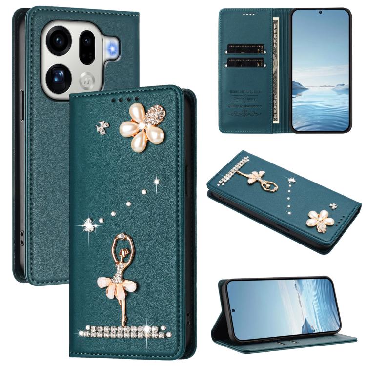For OPPO Find X9 Pro Ballet Girl Diamond Studded RFID Vegan Leather Phone Case(Peacock Green)