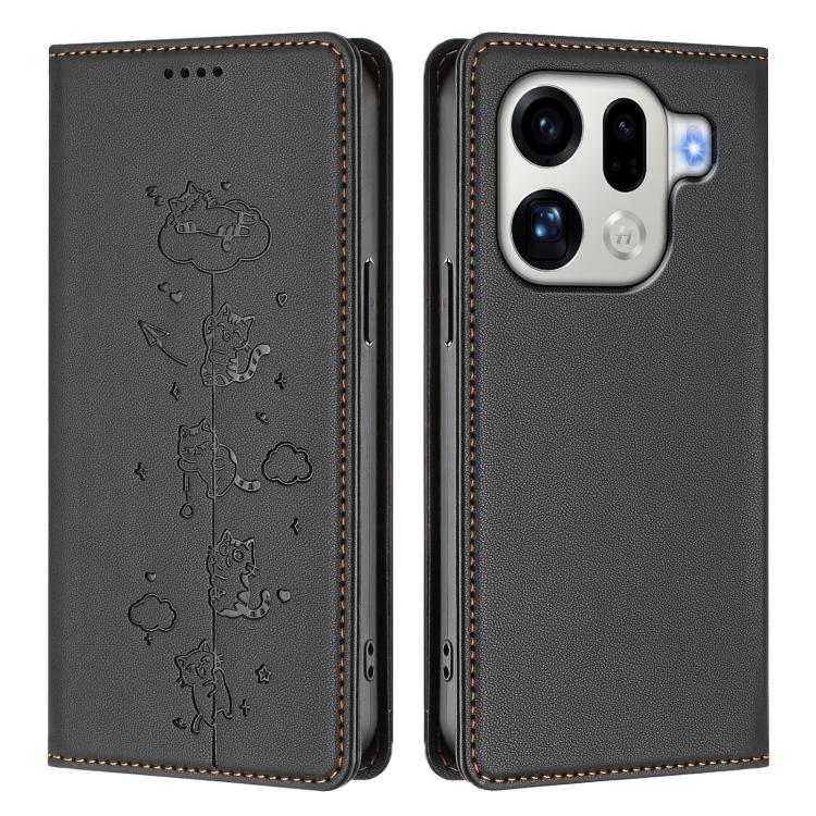For OPPO Find X9 Pro Cute Cats Embossed Magnetic RFID Vegan Leather Phone Case(Black)