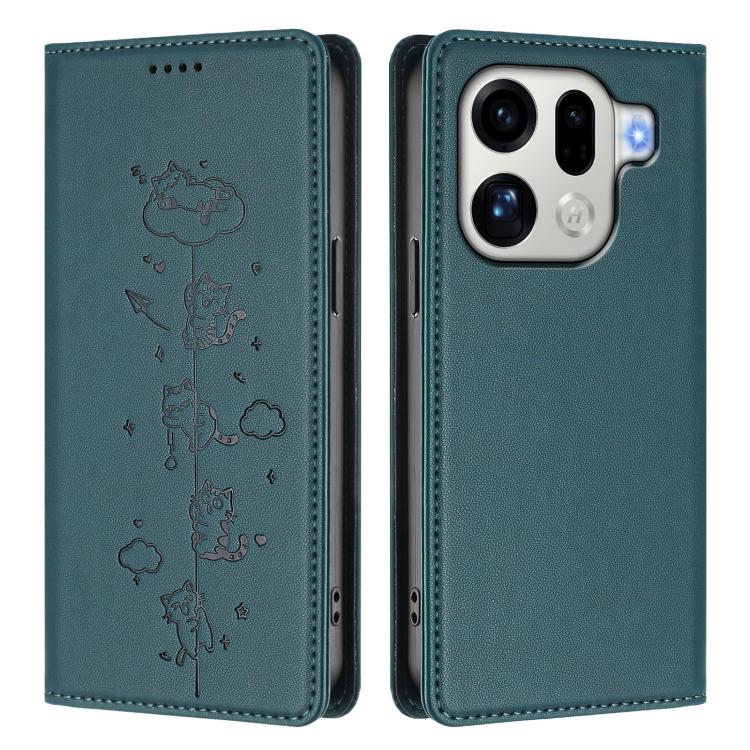 For OPPO Find X9 Pro Cute Cats Embossed Magnetic RFID Vegan Leather Phone Case(Peacock Green)