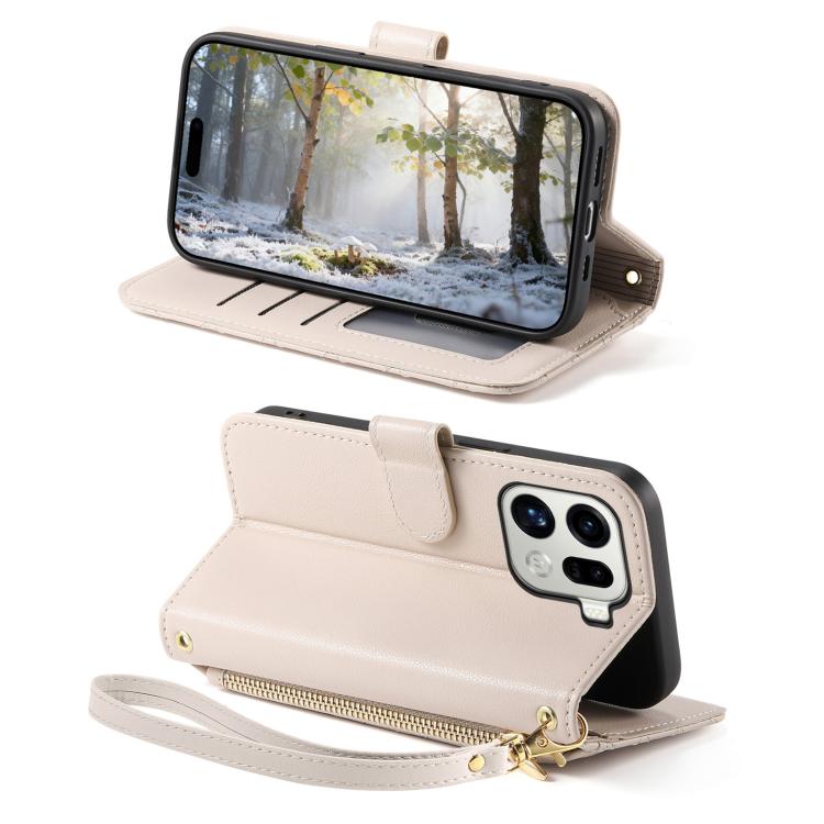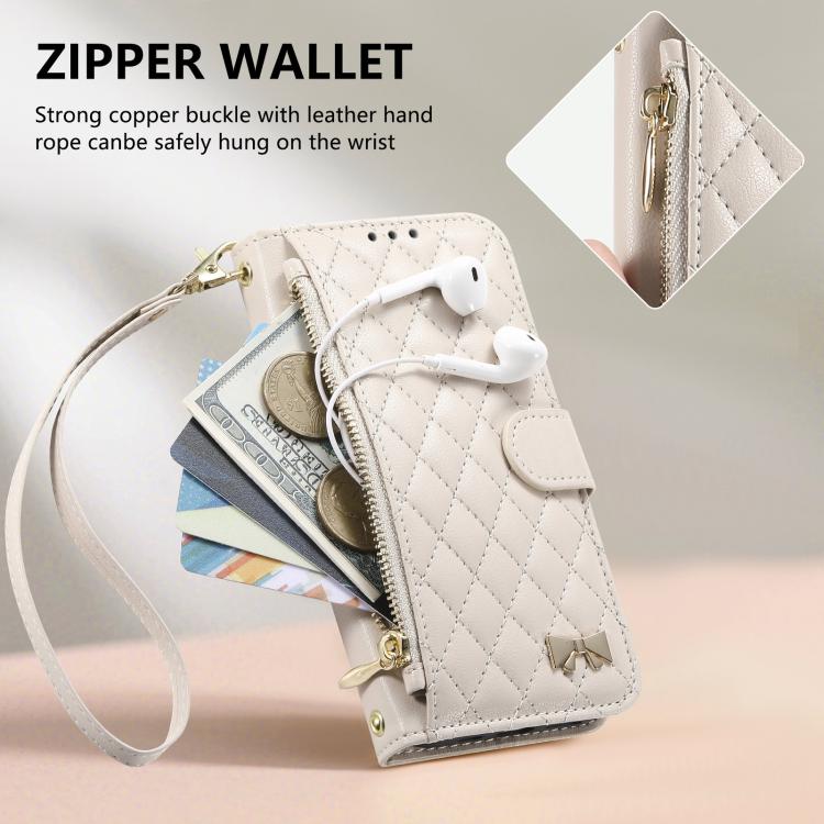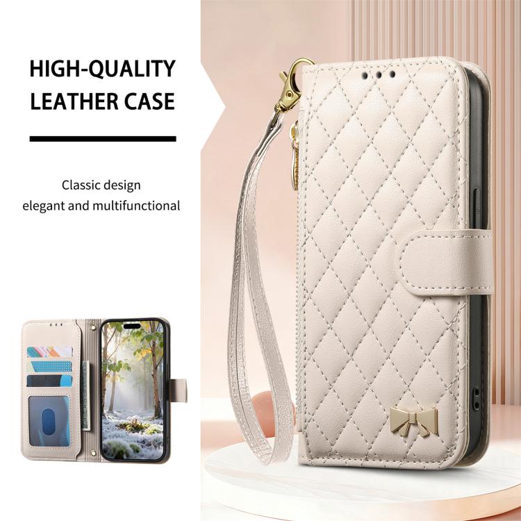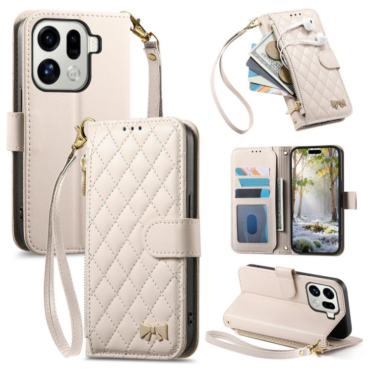 For OPPO Find X9 Pro Rhombic Texture Zipper Wallet Metal Bow-knot Vegan Leather Phone Case with Strap(Beige)