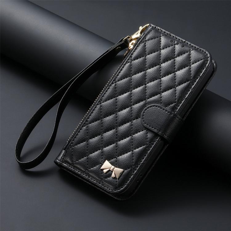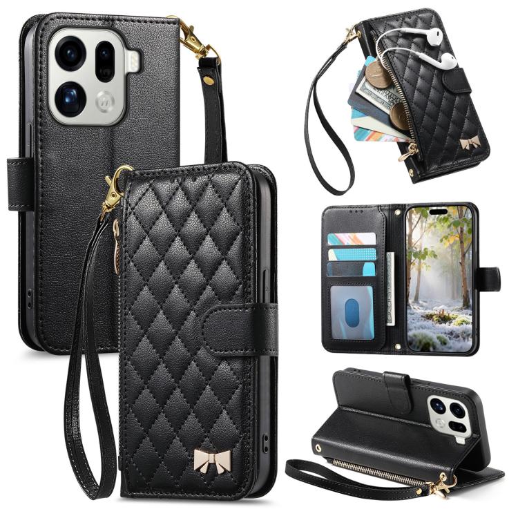 For OPPO Find X9 Pro Rhombic Texture Zipper Wallet Metal Bow-knot Vegan Leather Phone Case with Strap(Black)
