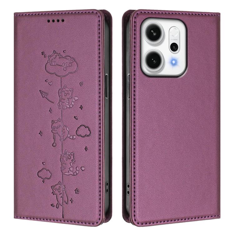 For OPPO Reno14 Pro 5G Global Cute Cats Embossed Magnetic RFID Vegan Leather Phone Case(Violet Purple)