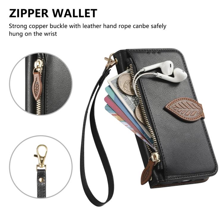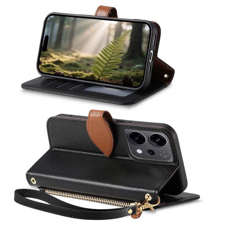 For OPPO Reno14 Pro 5G Global Leaf Buckle Zipper Wallet Leather Phone Case with Strap(Black)