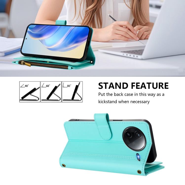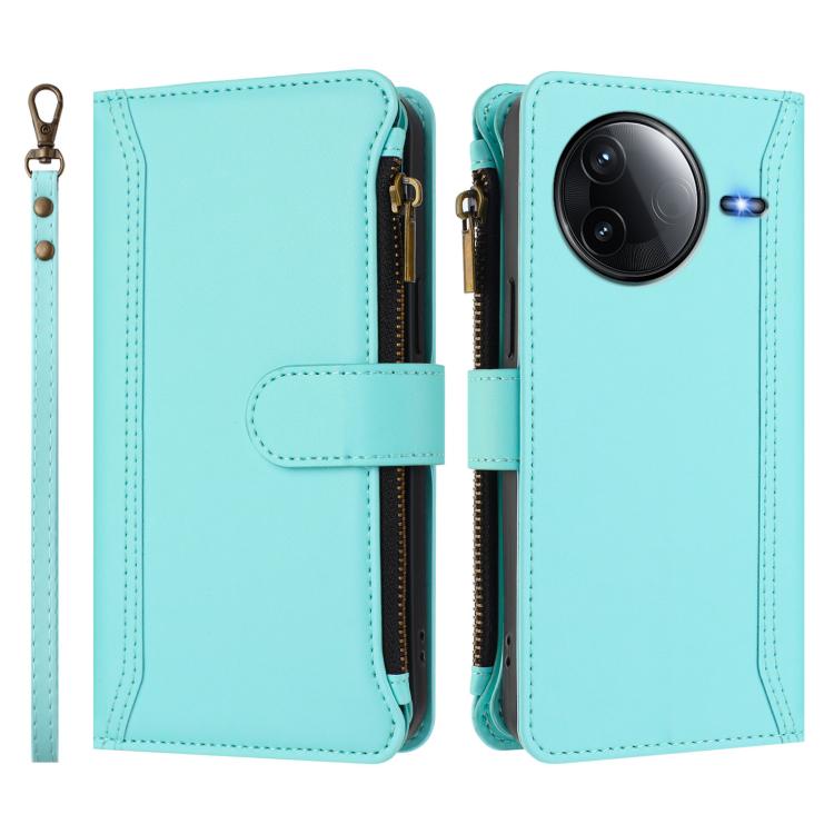 For Redmi K80 / K80 Pro Magnetic Closure 9 Card Slots Zipper Leather Case with Hand Strap(Mint Green)