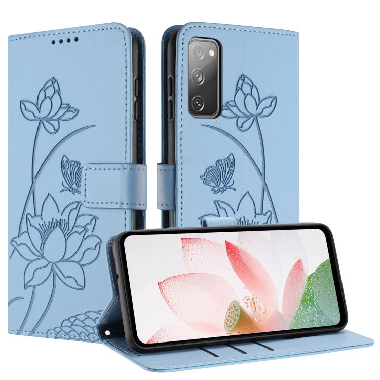 For Samsung Galaxy S20 FE Lotus Embossed Leather Phone Case with Lanyard(Blue)