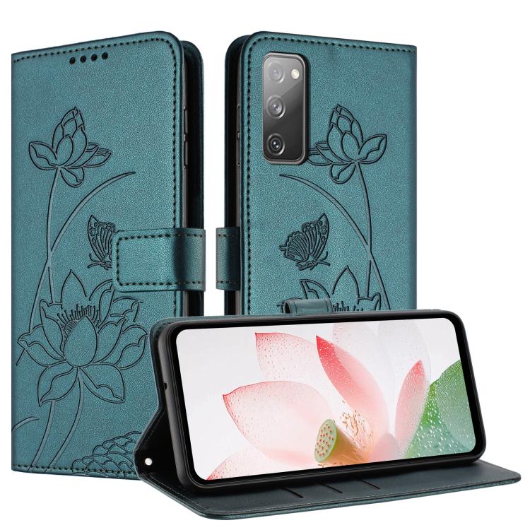 For Samsung Galaxy S20 FE Lotus Embossed Leather Phone Case with Lanyard(Dark Green)