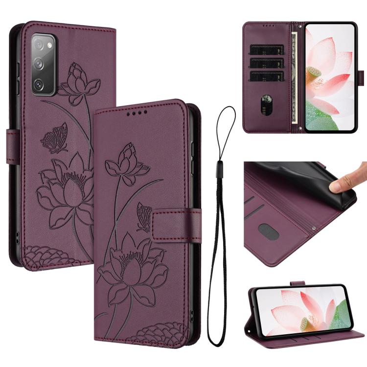 For Samsung Galaxy S20 FE Lotus Embossed Leather Phone Case with Lanyard(Wine Red)