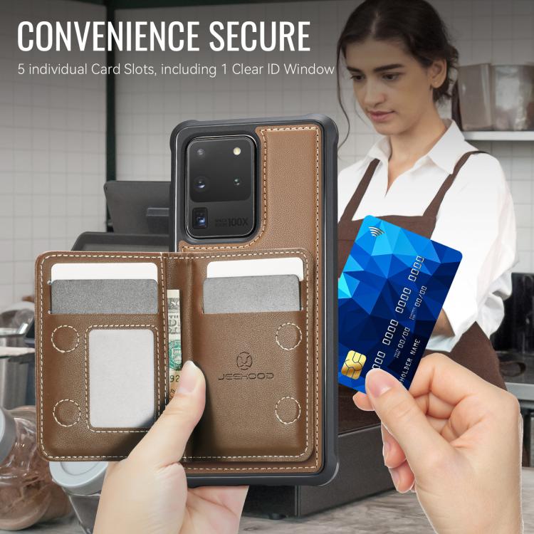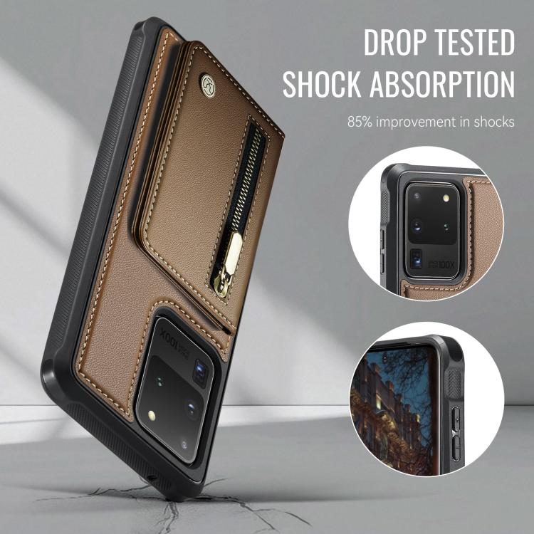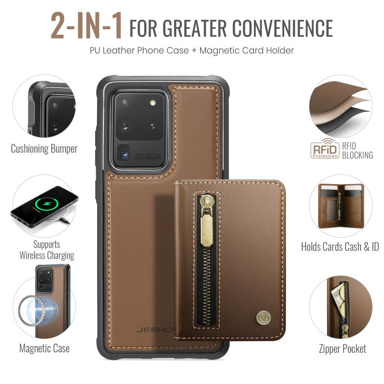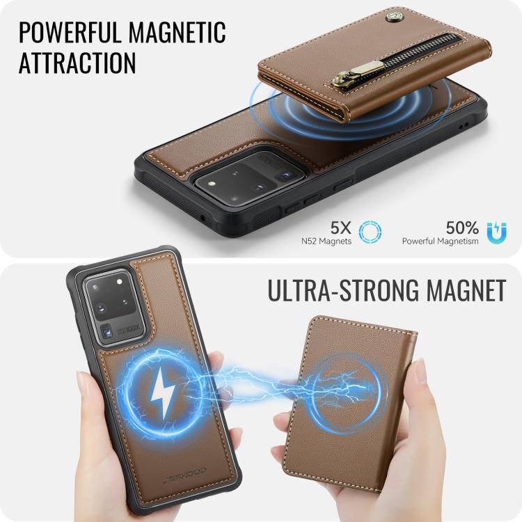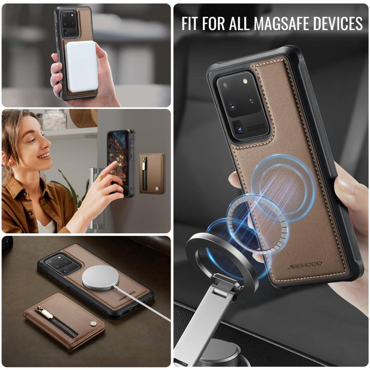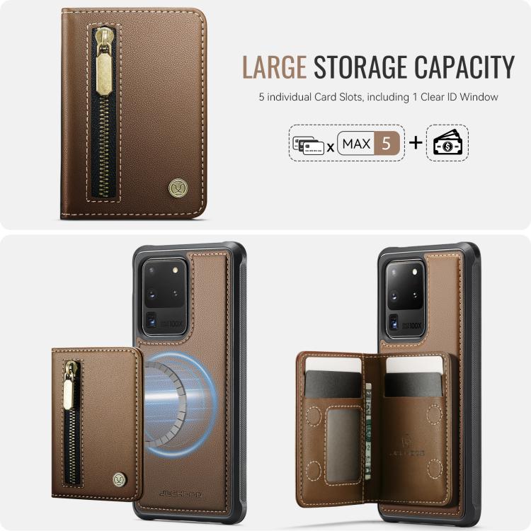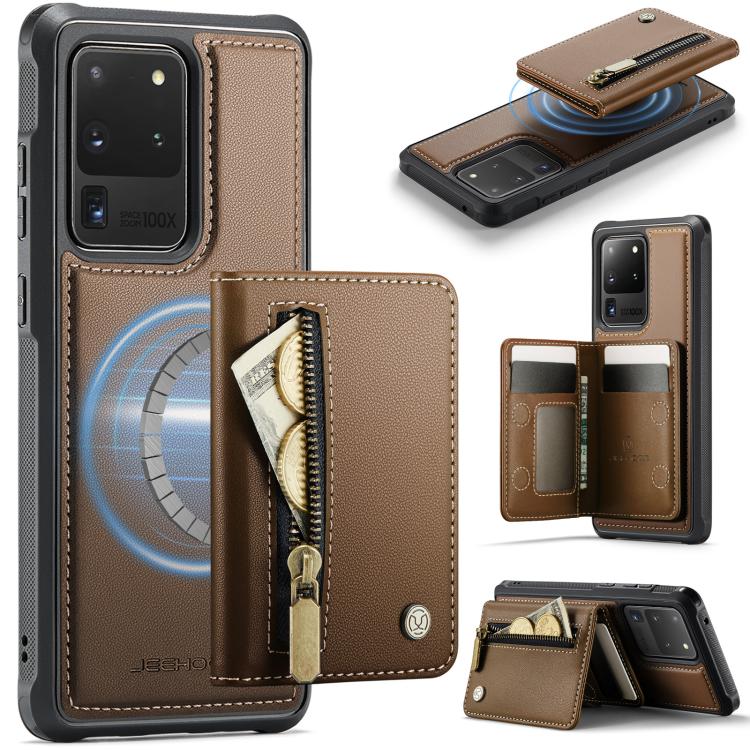 For Samsung Galaxy S20 Ultra 5G JEEHOOD J12 Exquisite RFID MagSafe Zipper Card Bag Phone Case(Brown)