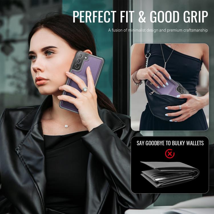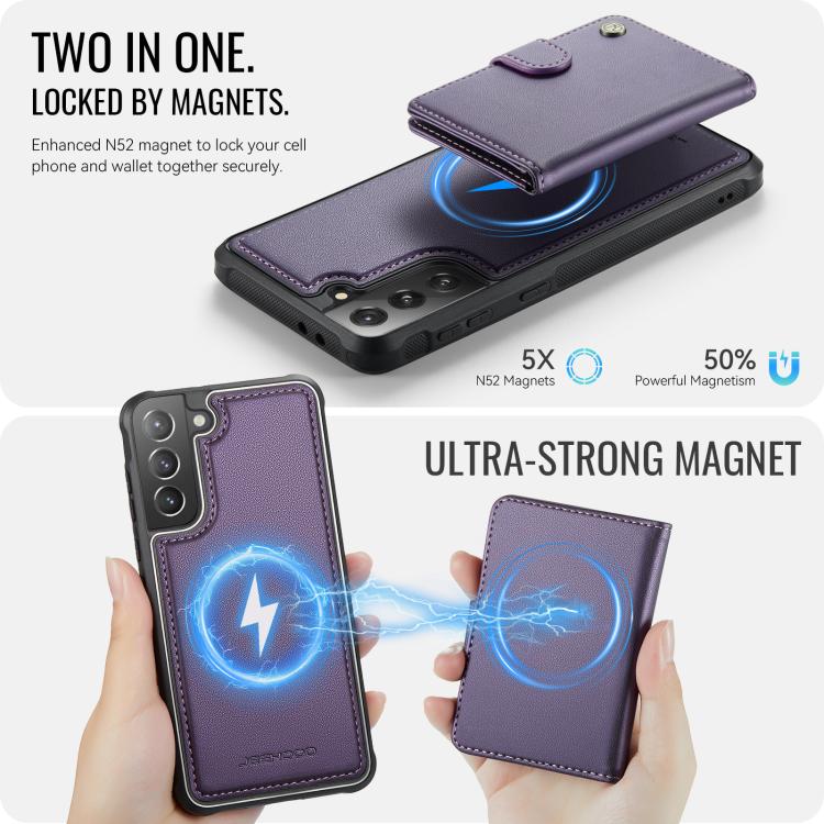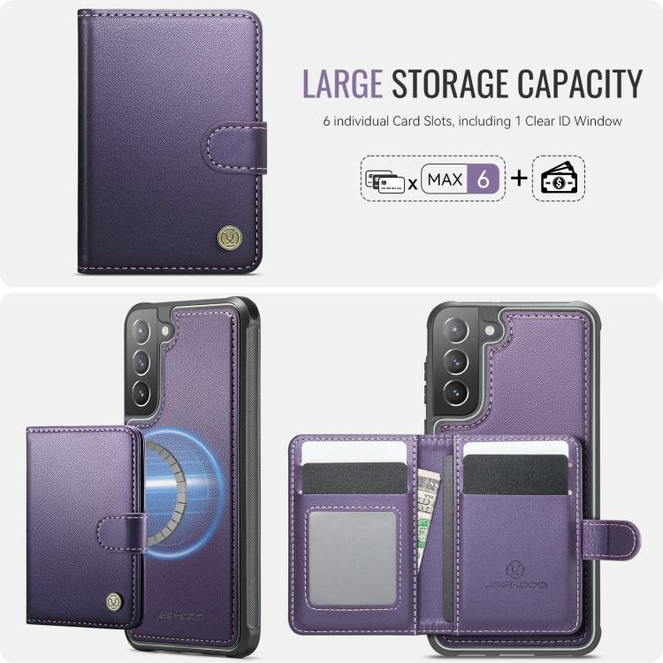 For Samsung Galaxy S21+ 5G JEEHOOD J09 Buckle Card Bag MagSafe Magnetic Style RFID Leather Phone Case(Purple)