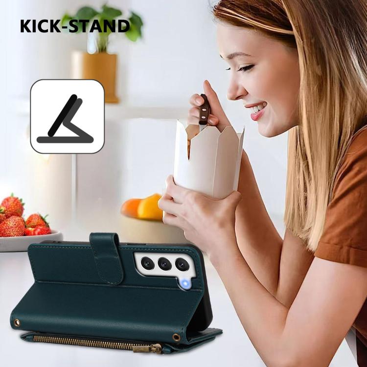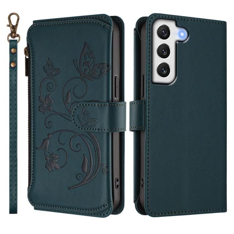 For Samsung Galaxy S22+ 5G Butterfly Love Flower Multi-card Zipper Wallet Leather Phone Case(Dark Green)