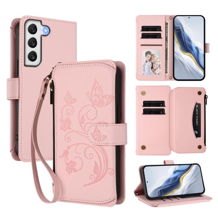 For Samsung Galaxy S22+ 5G Butterfly Love Flower Multi-card Zipper Wallet Leather Phone Case(Pink)