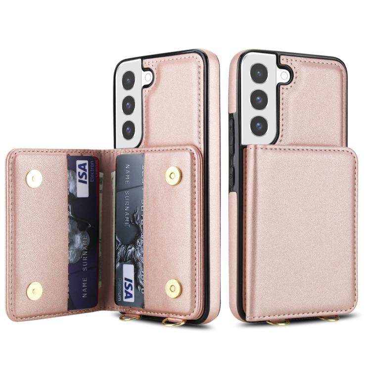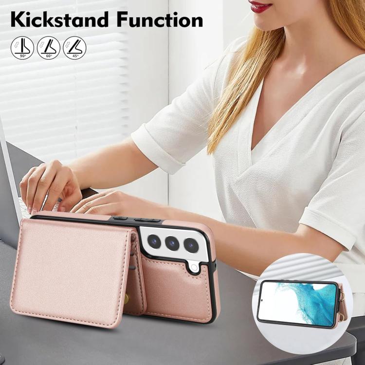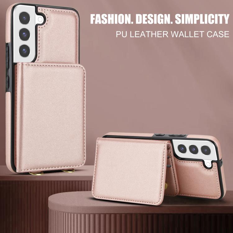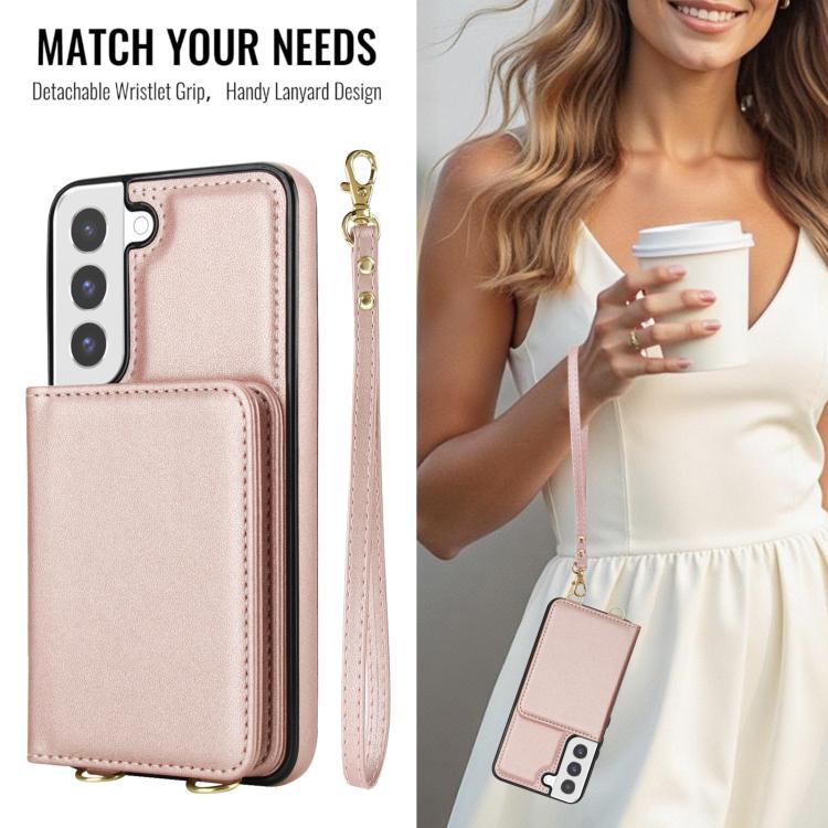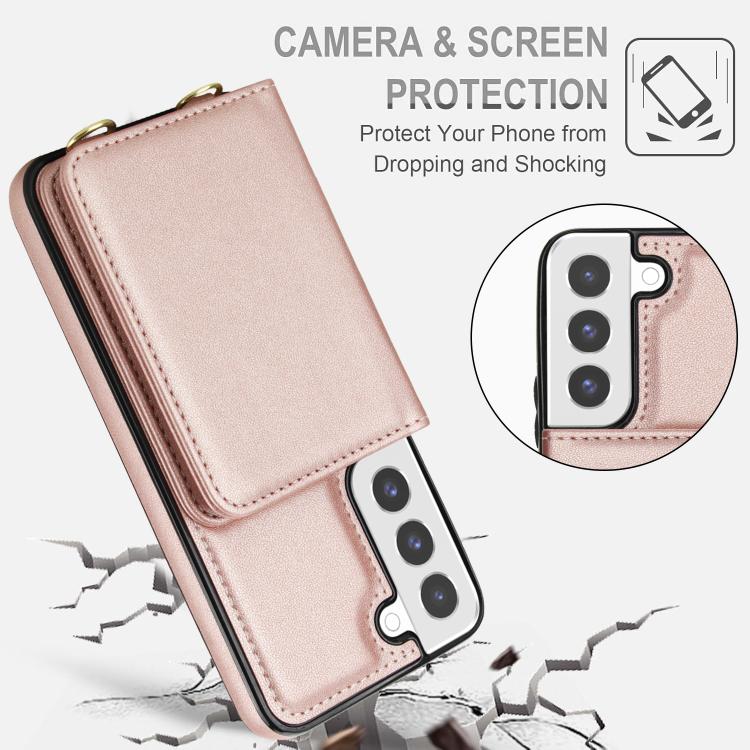 For Samsung Galaxy S22+ 5G Crossbody Dual-buckle Wallet RFID Back Leather Phone Case(Rose Gold)