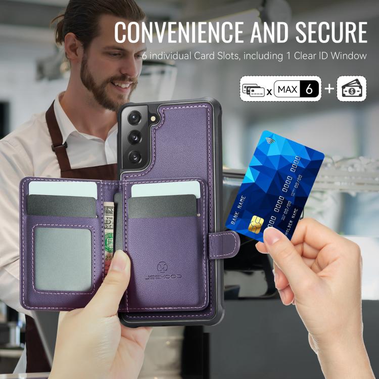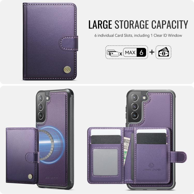 For Samsung Galaxy S22+ 5G JEEHOOD J09 Buckle Card Bag MagSafe Magnetic Style RFID Leather Phone Case(Purple)
