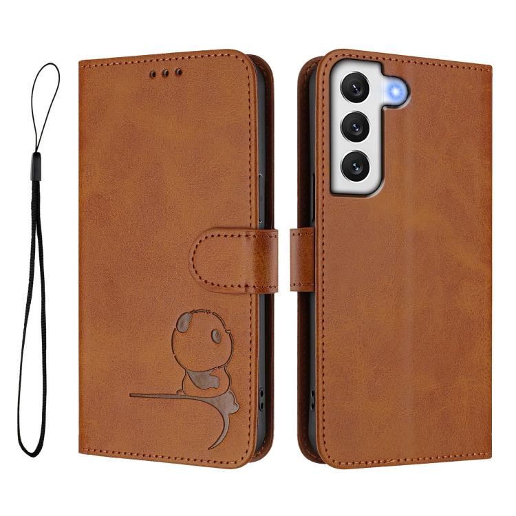 For Samsung Galaxy S22+ 5G Litter Panda Embossing RFID Leather Phone Case with Lanyard(Brown)