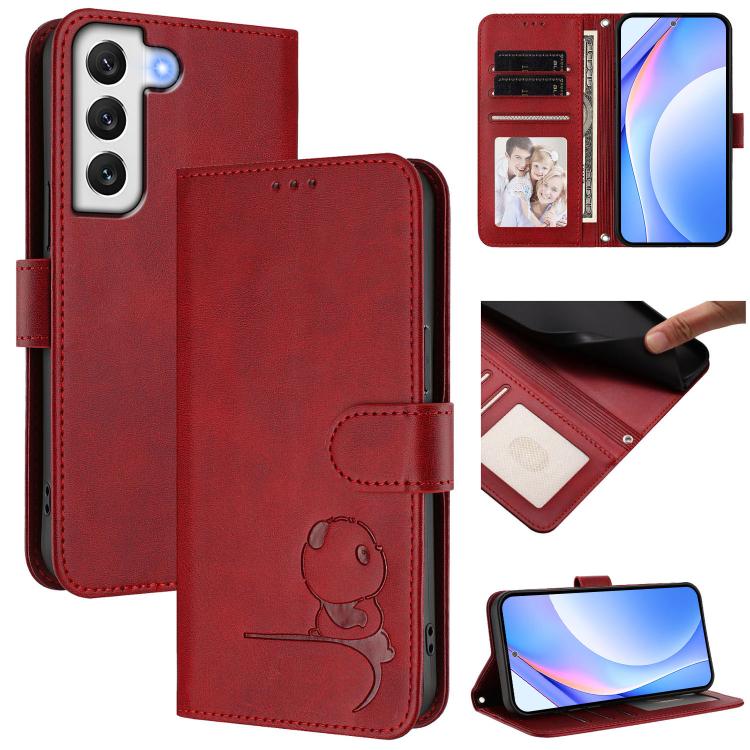 For Samsung Galaxy S22+ 5G Litter Panda Embossing RFID Leather Phone Case with Lanyard(Wine Red)