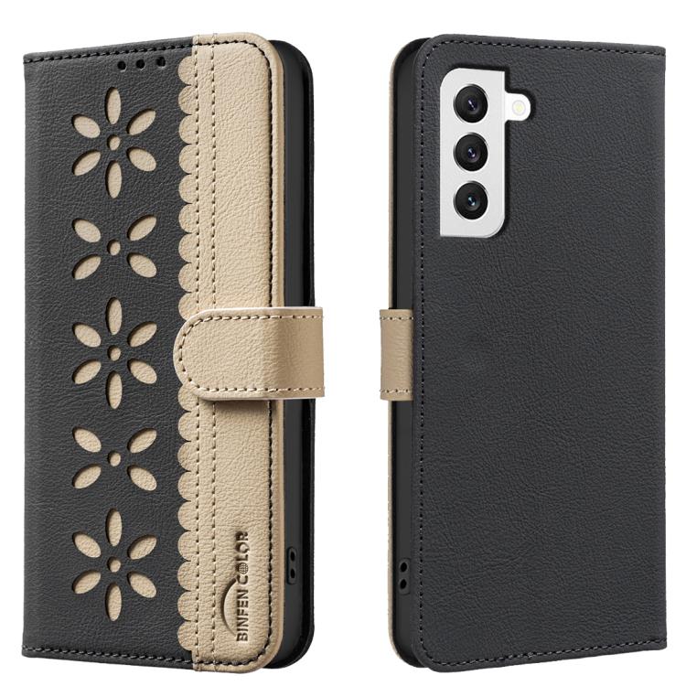 For Samsung Galaxy S22+ 5G Splicing Color Hollow Flower Pattern RFID Leather Phone Case(Black)