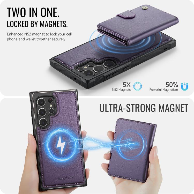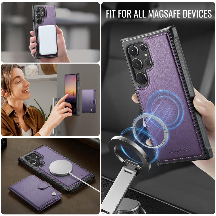 For Samsung Galaxy S22 Ultra 5G JEEHOOD J09 Buckle Card Bag MagSafe Magnetic Style RFID Leather Phone Case(Purple)