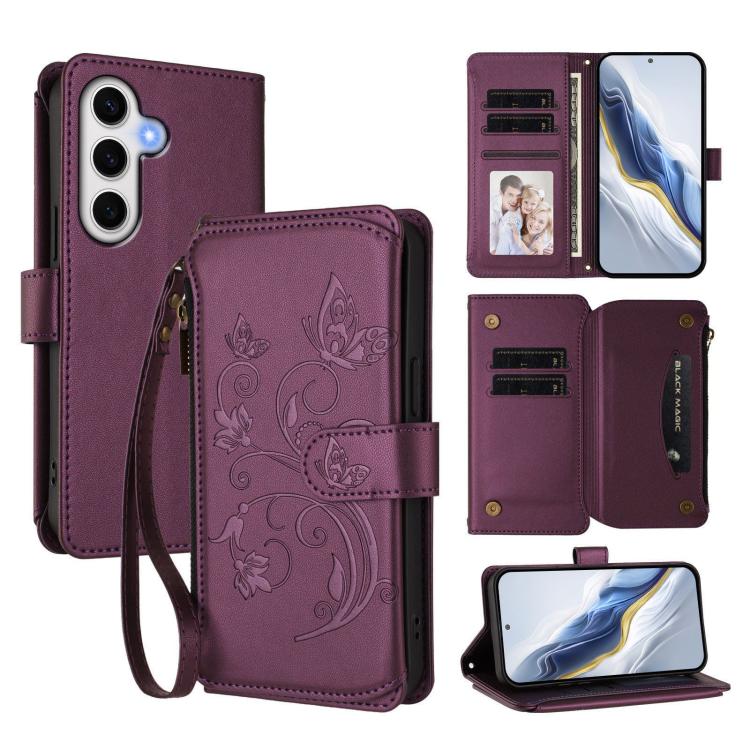 For Samsung Galaxy S24 FE 5G Butterfly Love Flower Multi-card Zipper Wallet Leather Phone Case(Dark Purple)