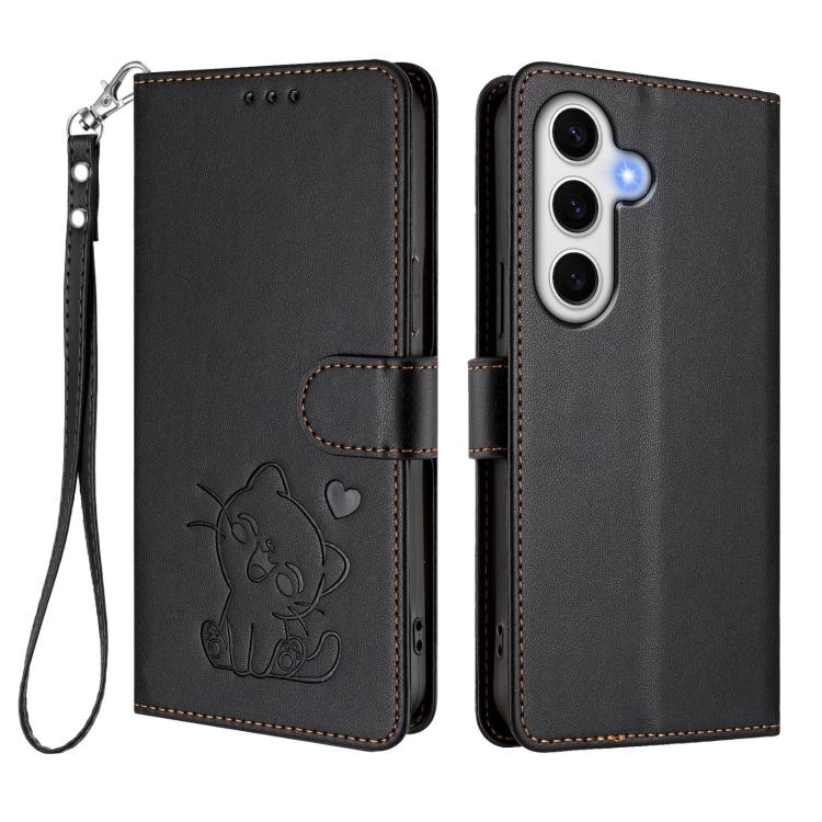 For Samsung Galaxy S24 FE 5G Embossed Heart Cat Leather Phone Case with Hand Strap(Black)