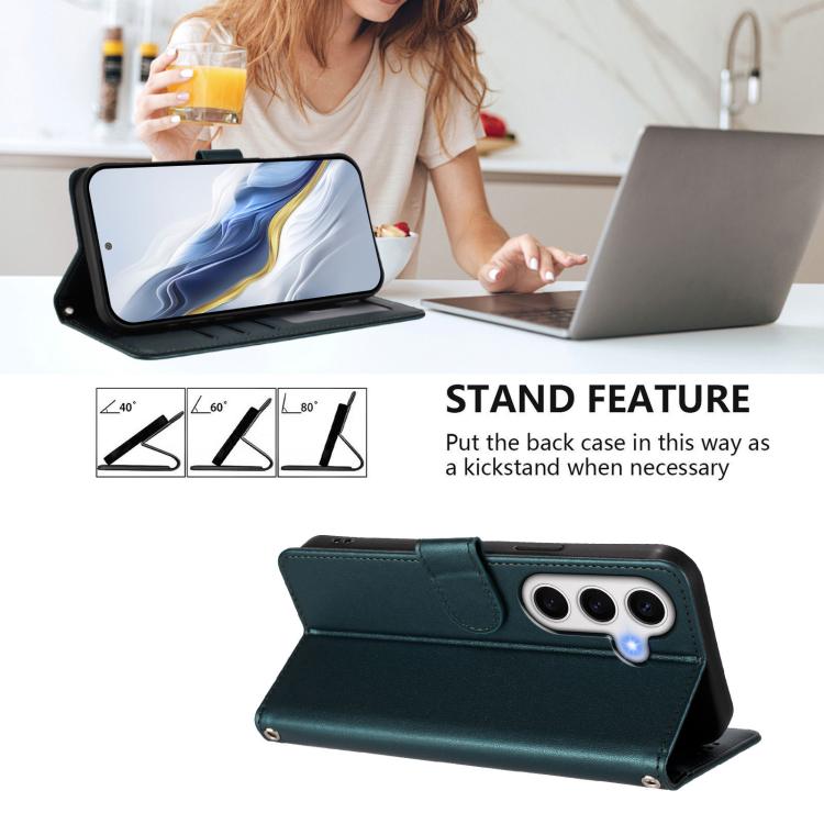 For Samsung Galaxy S24 FE 5G Embossed Heart Cat Leather Phone Case with Hand Strap(Dark Green)