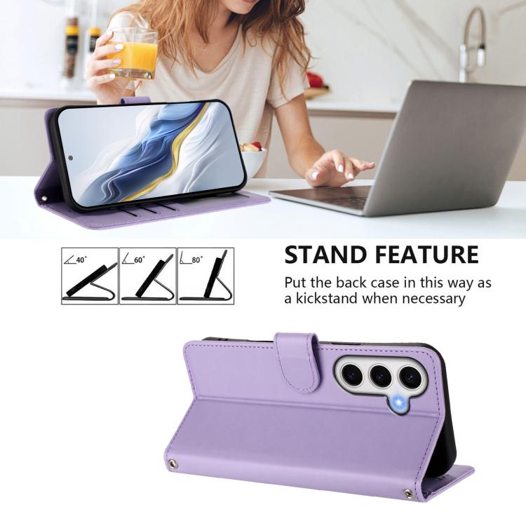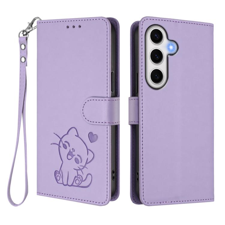 For Samsung Galaxy S24 FE 5G Embossed Heart Cat Leather Phone Case with Hand Strap(Light Purple)