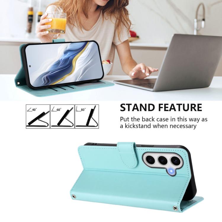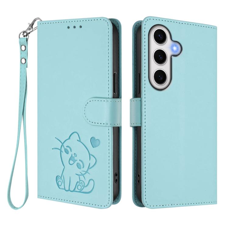 For Samsung Galaxy S24 FE 5G Embossed Heart Cat Leather Phone Case with Hand Strap(Mint Green)