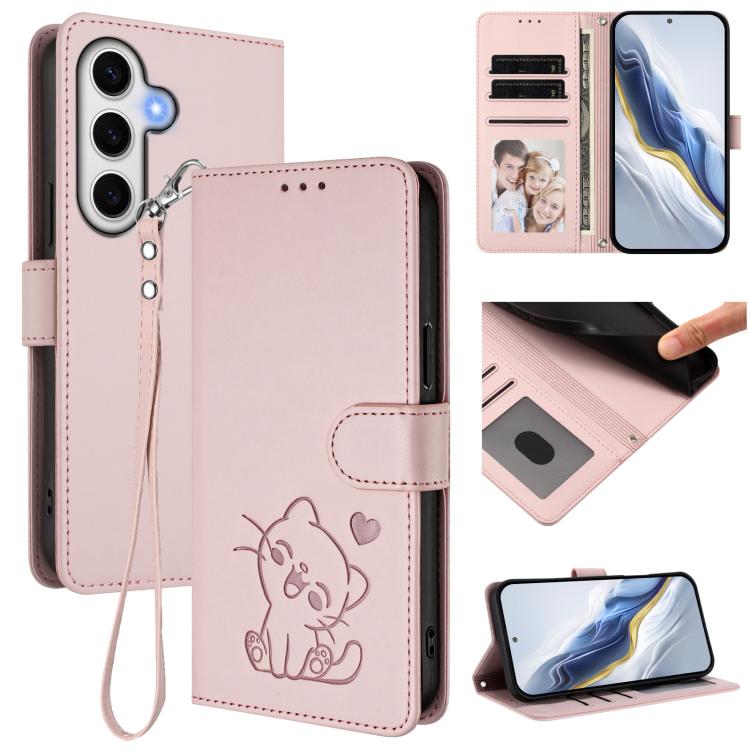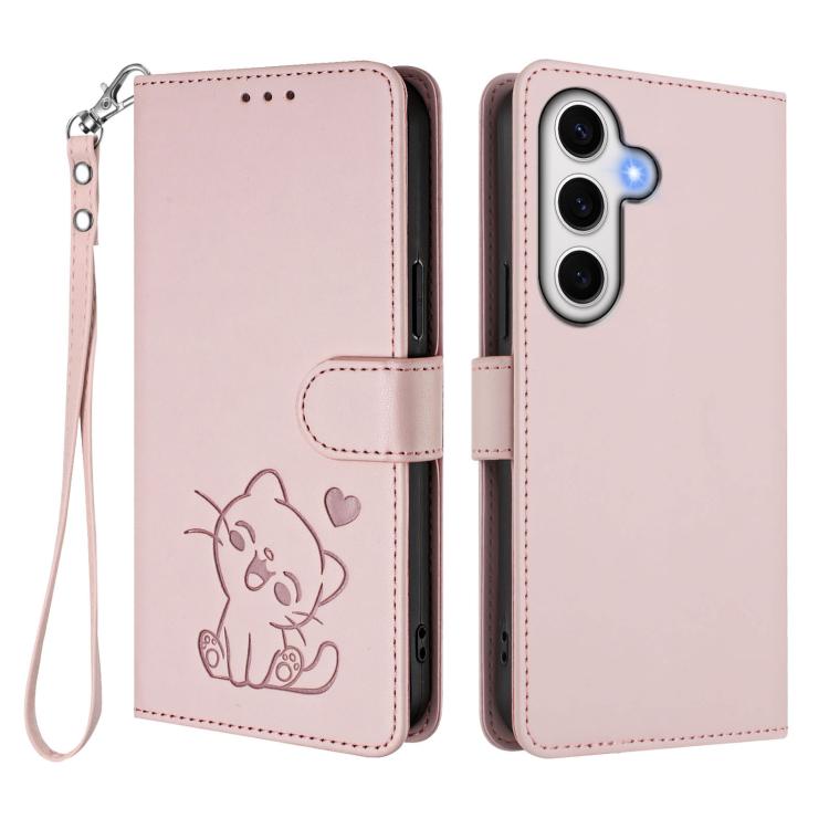 For Samsung Galaxy S24 FE 5G Embossed Heart Cat Leather Phone Case with Hand Strap(Pink)
