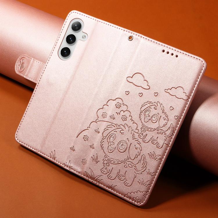 For Samsung Galaxy S24 FE 5G Embossed Heart Dog RFID Blocking Wallet Leather Phone Case(Rose Gold)
