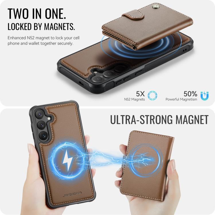 For Samsung Galaxy S24 FE 5G JEEHOOD J09 Buckle Card Bag MagSafe Magnetic Style RFID Leather Phone Case(Brown)