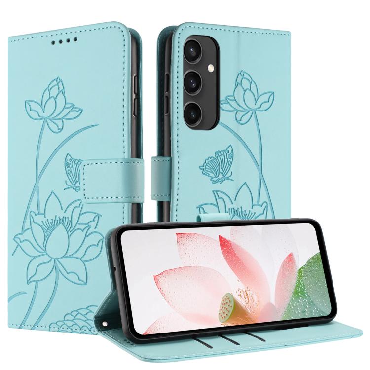 For Samsung Galaxy S24 FE 5G Lotus Embossed Leather Phone Case with Lanyard(Green)