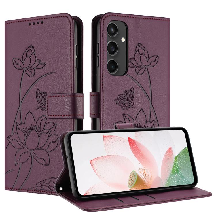 For Samsung Galaxy S24 FE 5G Lotus Embossed Leather Phone Case with Lanyard(Wine Red)