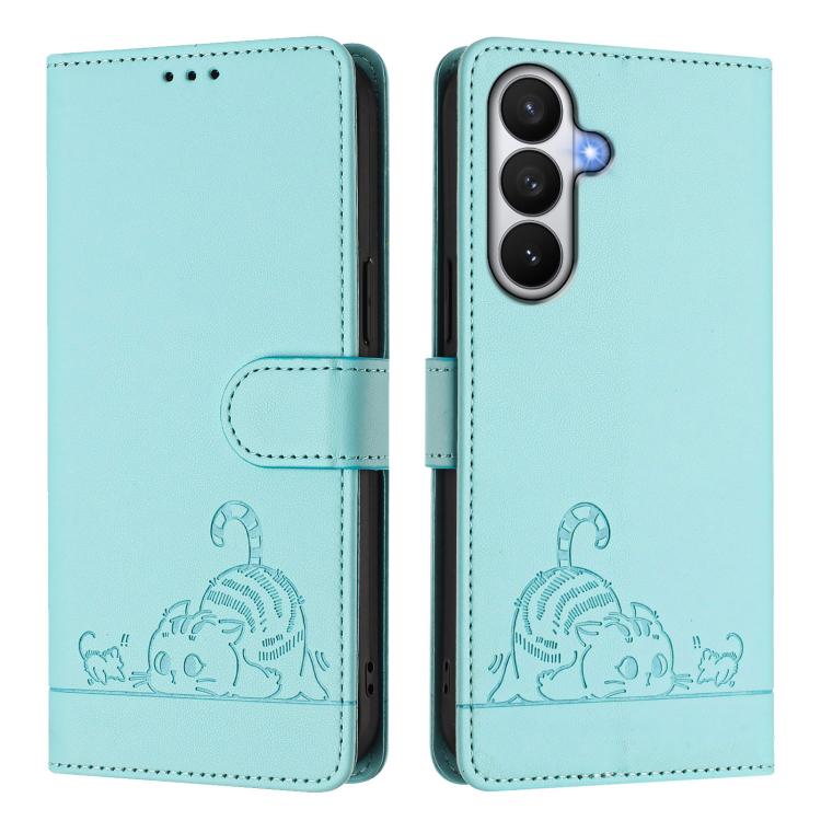 For Samsung Galaxy S26 Pro 5G Cat Rat Embossed Pattern RFID Leather Phone Case with Lanyard(Mint Green)