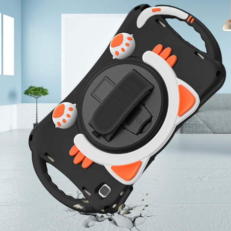 For Samsung Galaxy Tab A7 10.4 2020 SM-T500 Cute Cat King Kids Shockproof Silicone Tablet Case with Holder & Shoulder Strap & Handle(Black Orange)