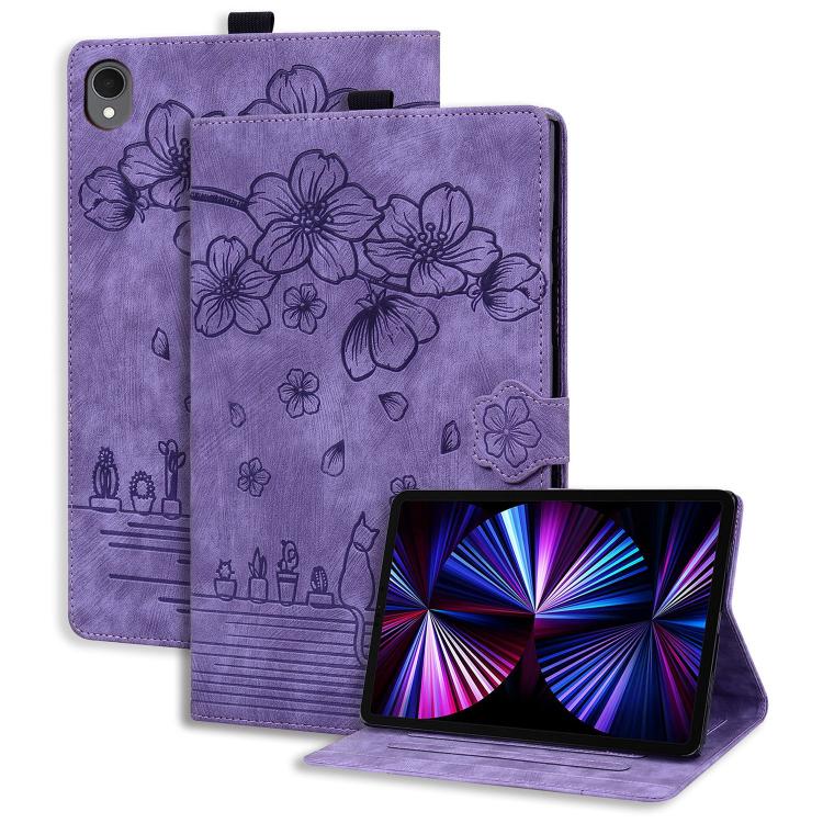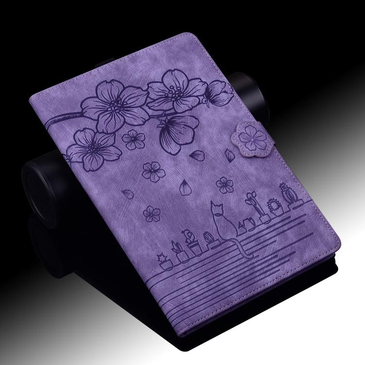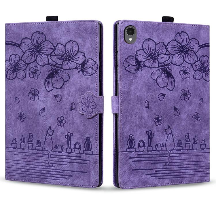 For Samsung Galaxy Tab S11 Cartoon Sakura Cat Embossed Smart Leather Tablet Case(Purple)