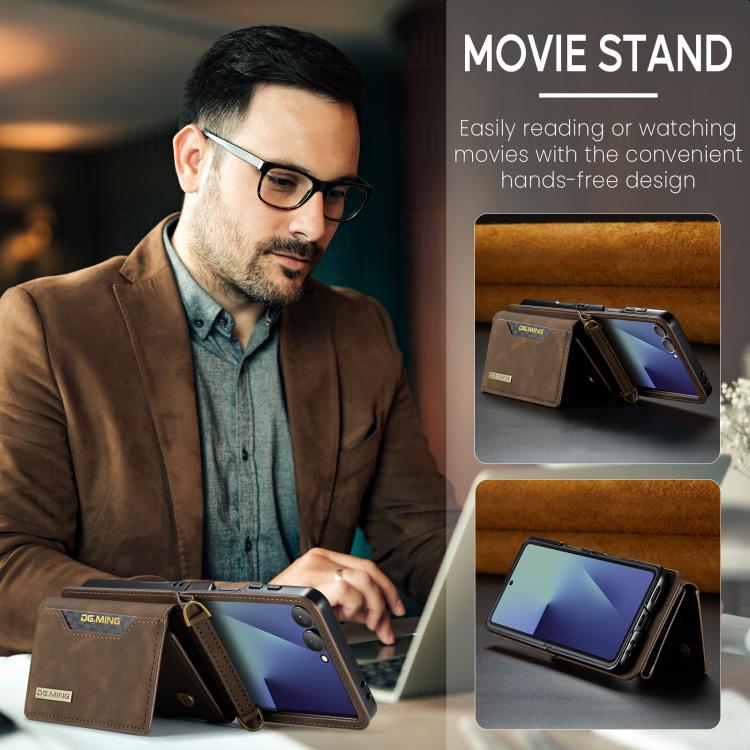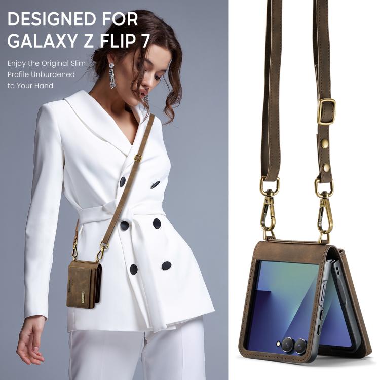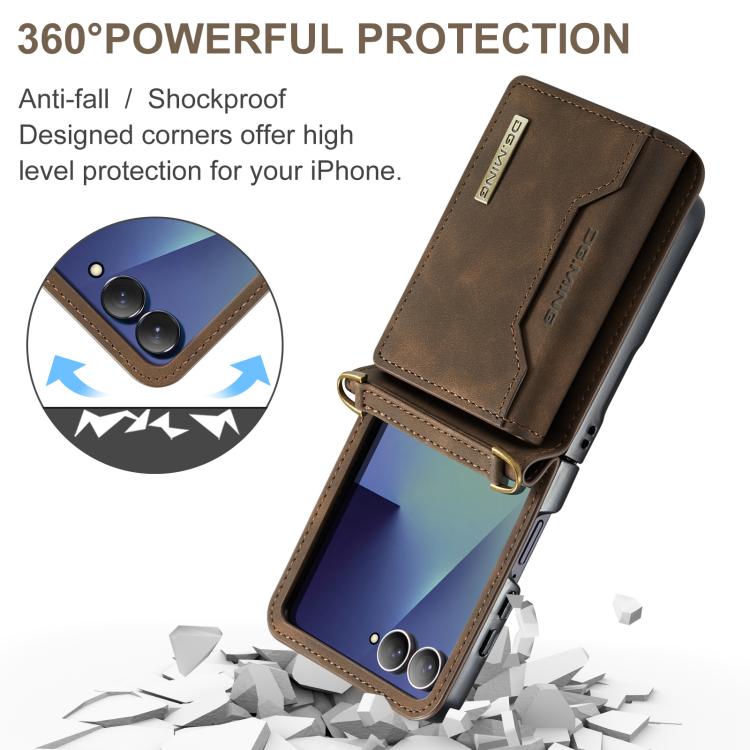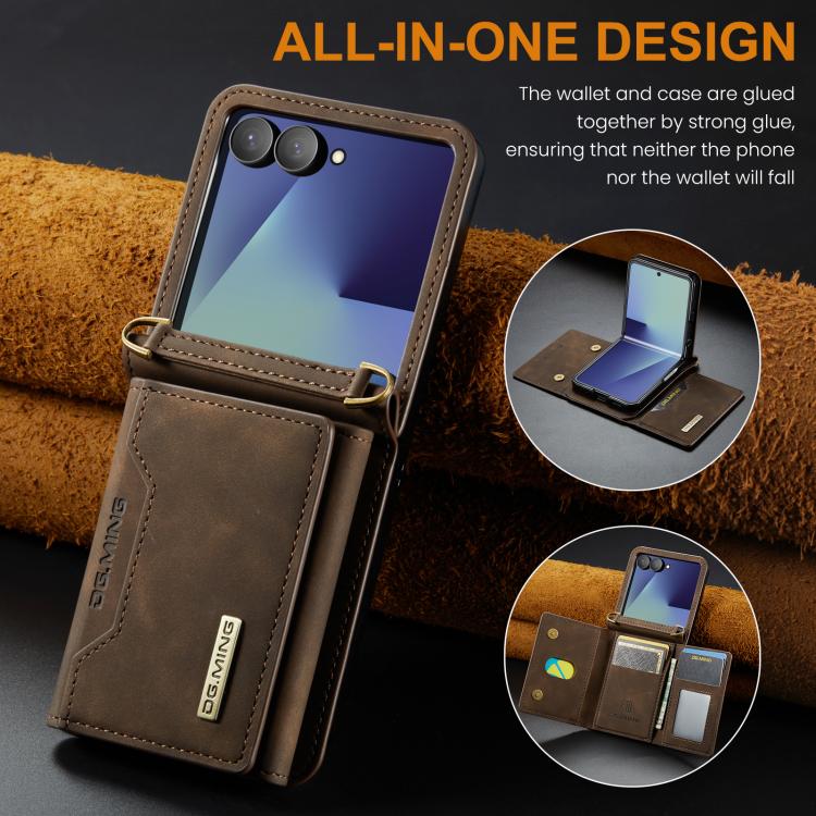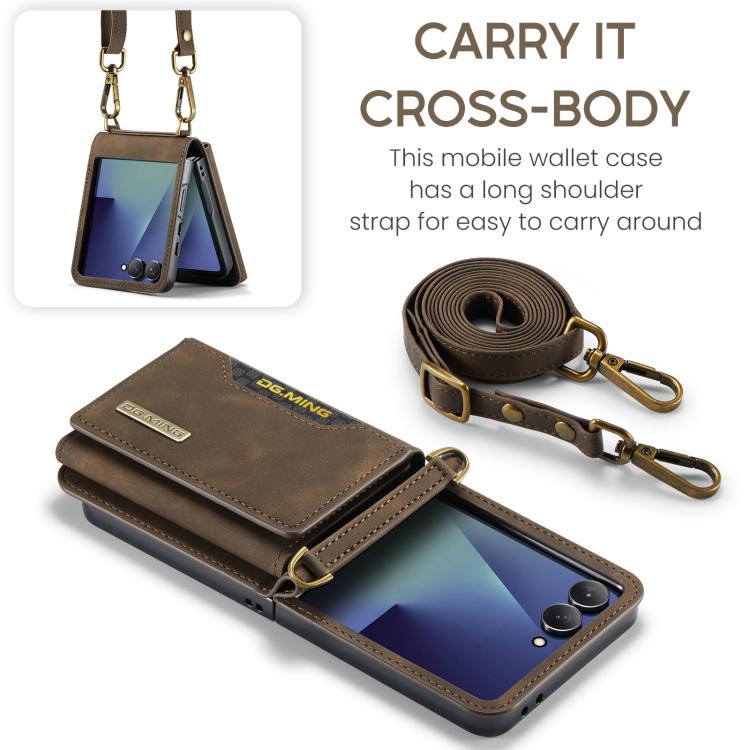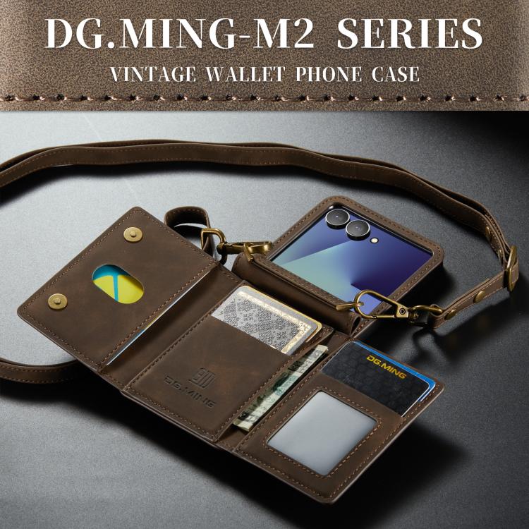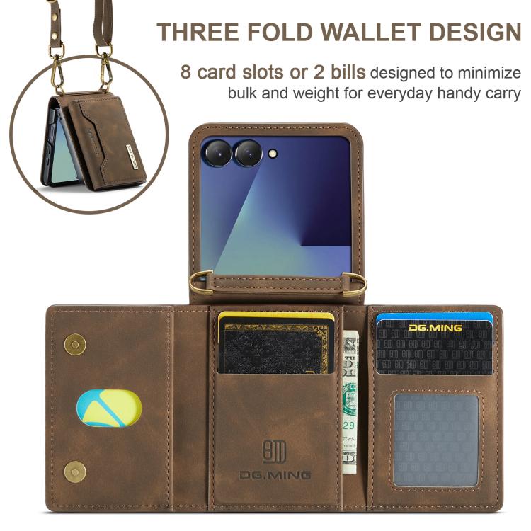 For Samsung Galaxy Z Flip7 5G DG.MING M2 Series 3-Fold Multi Card Bag hybrid Magnetic Phone Case with Long Lanyard(Coffee)