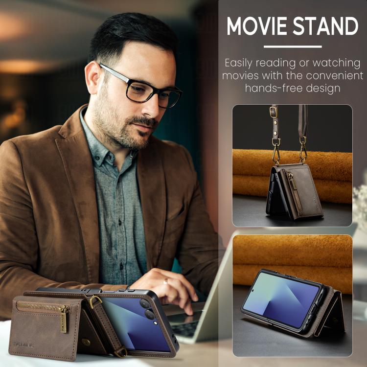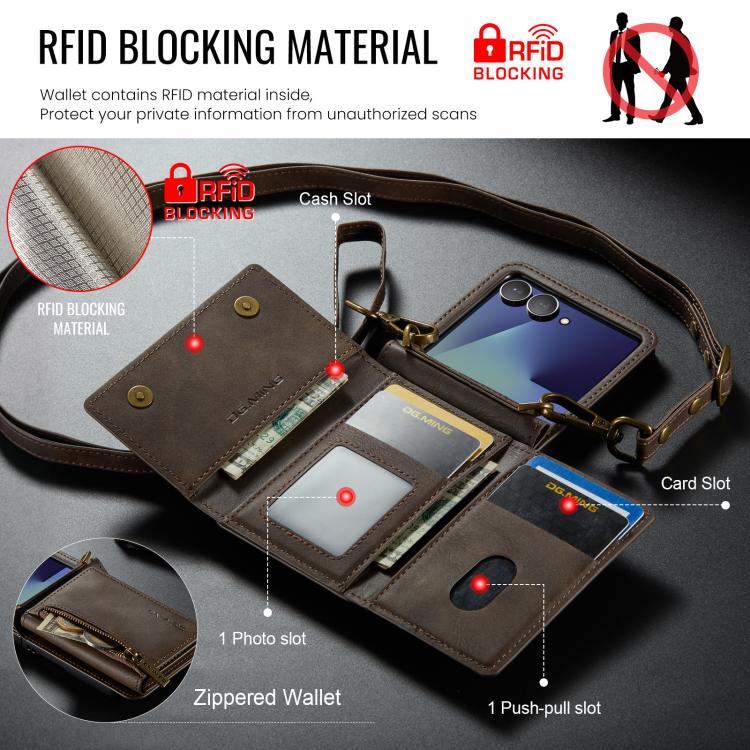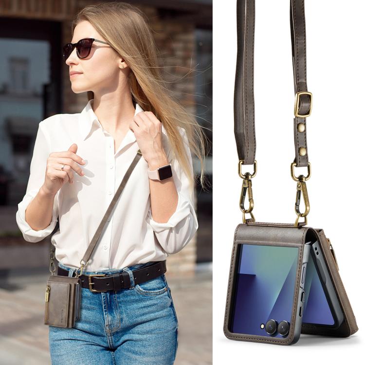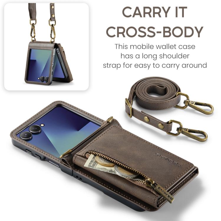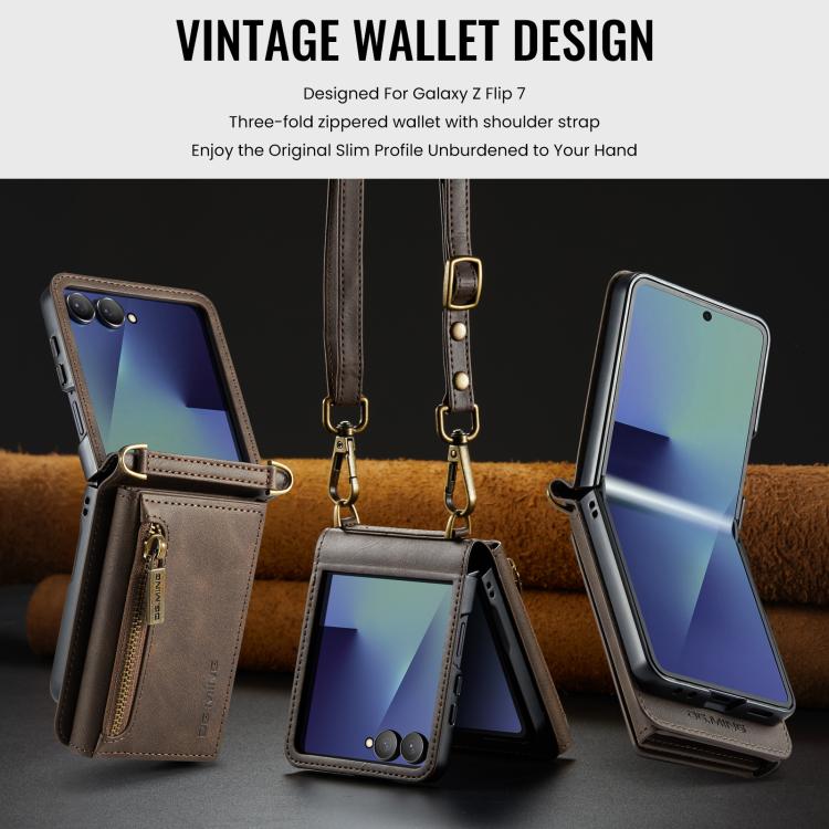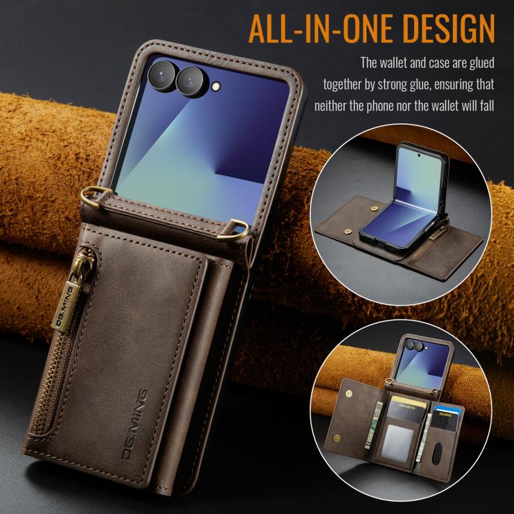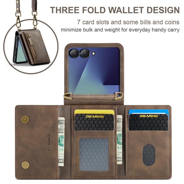For Samsung Galaxy Z Flip7 5G DG.MING M5 Series Zip RFID Multi Card Detachable Leather Phone Case with Long Lanyard(Coffee)